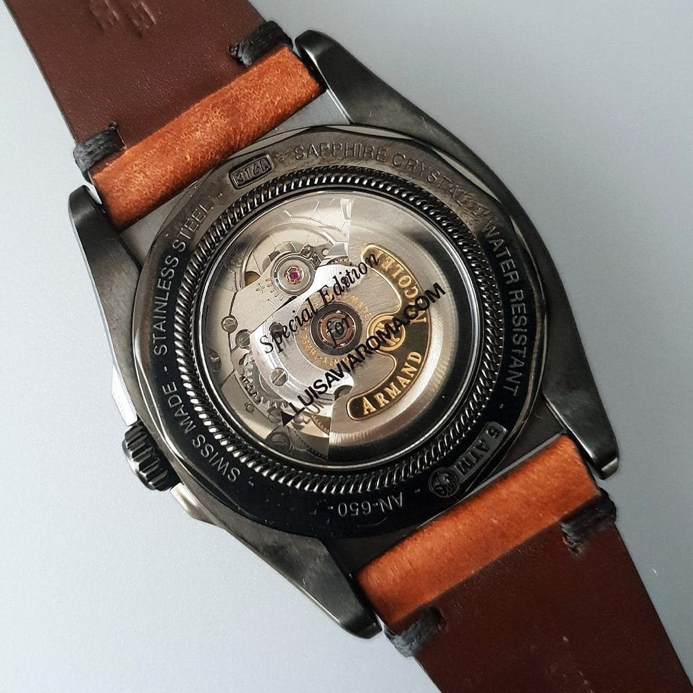 El Armand Nicolet J09 Special Edition LuisAviaRoma destaca por su movimiento automático AN 2846-9 con 23 rubíes y 36 horas de reserva de marcha, ofreciendo precisión confiable y suavidad en el segundero central.