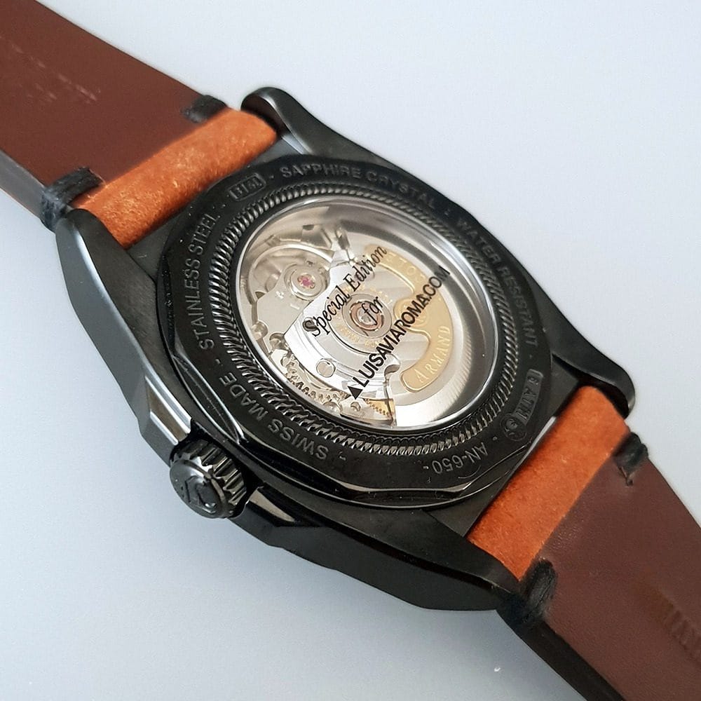 Con resistencia al agua de 5 ATM, este modelo es apto para uso diario y exposición a salpicaduras, aunque no para buceo. Su edición especial LuisAviaRoma lo convierte en un reloj exclusivo y coleccionable, ideal para aficionados de la relojería suiza de alta gama.