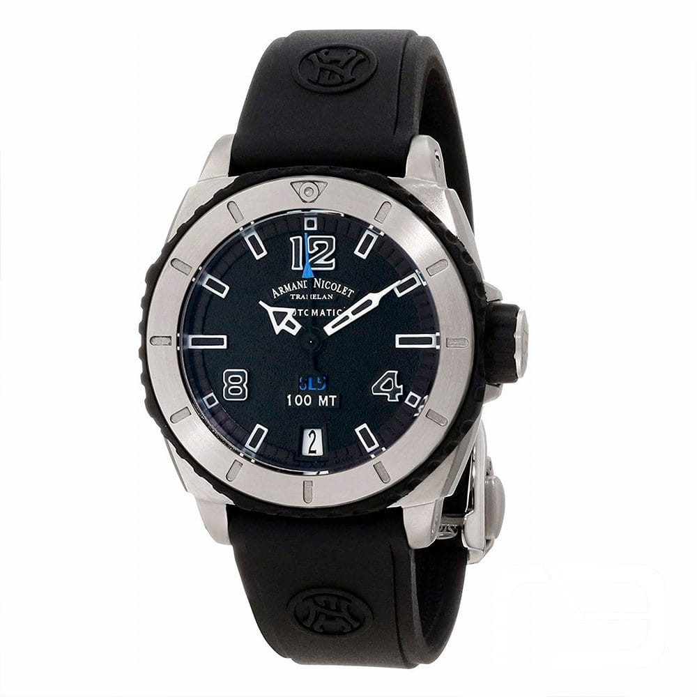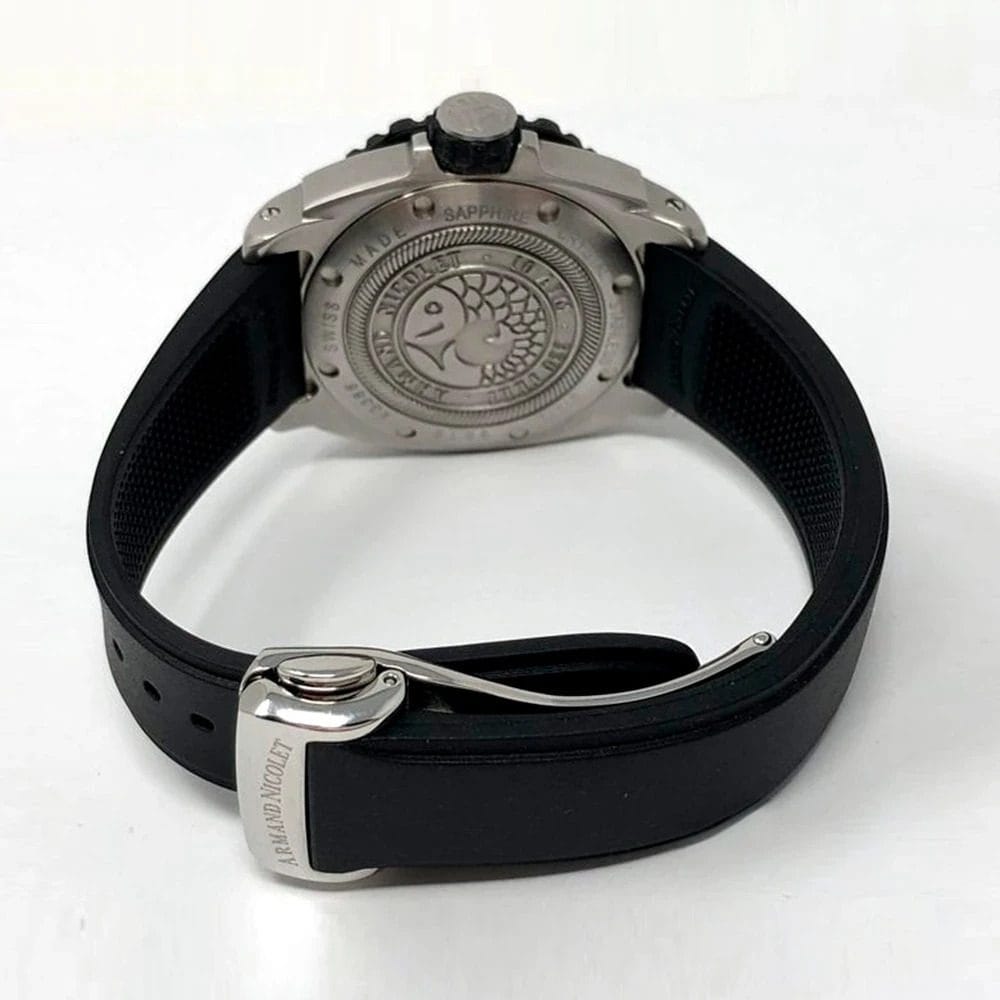 Armand Nicolet SL5 Ladies Equipado con un movimiento automático AN 2846-10 de 21 joyas y reserva de marcha de 48 horas, ofrece precisión y comodidad sin necesidad de cambiar batería. El cristal de zafiro esférico antirreflectante protege la esfera y asegura durabilidad. La correa de caucho negro con inscripciones de la marca y cierre deployante de acero inoxidable garantiza un ajuste seguro y cómodo.