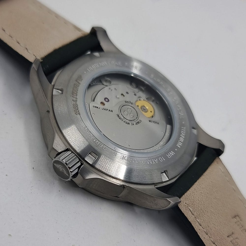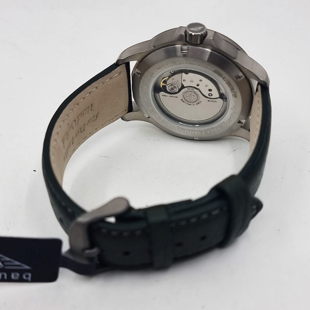 La correa de piel verde, combinada con una hebilla de titanio, aporta un toque elegante sin perder el espíritu deportivo del reloj. Con una resistencia al agua de 10 ATM (100 metros), es apto para natación y actividades acuáticas ligeras.