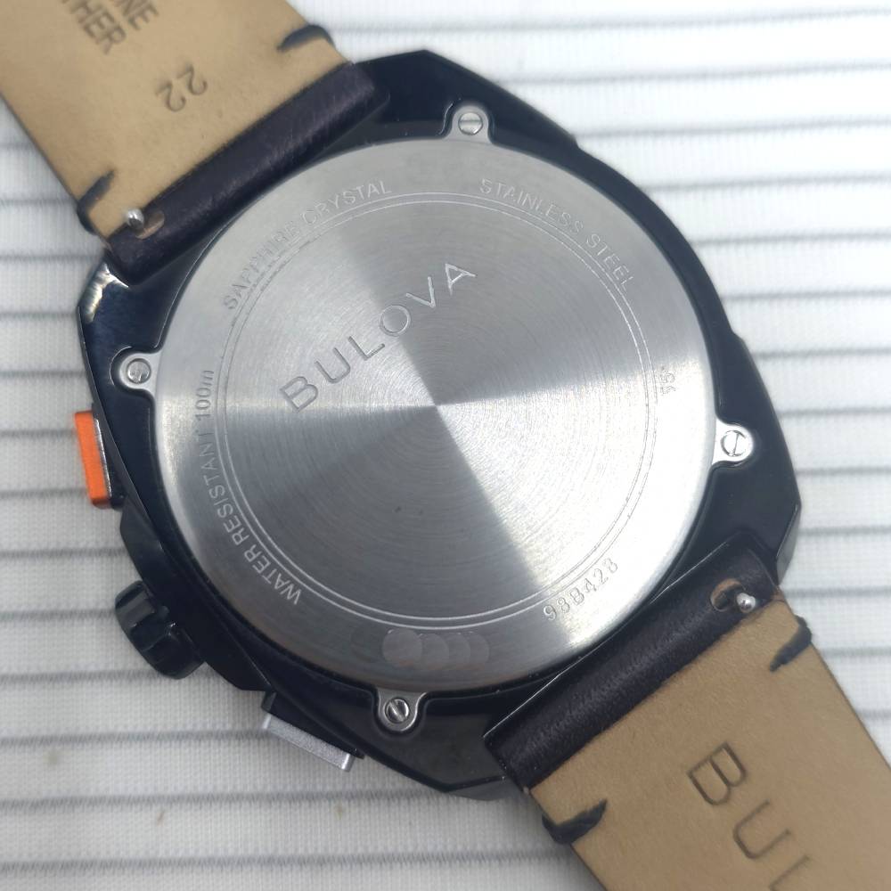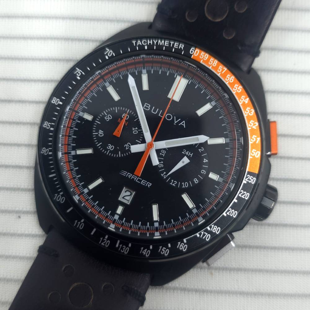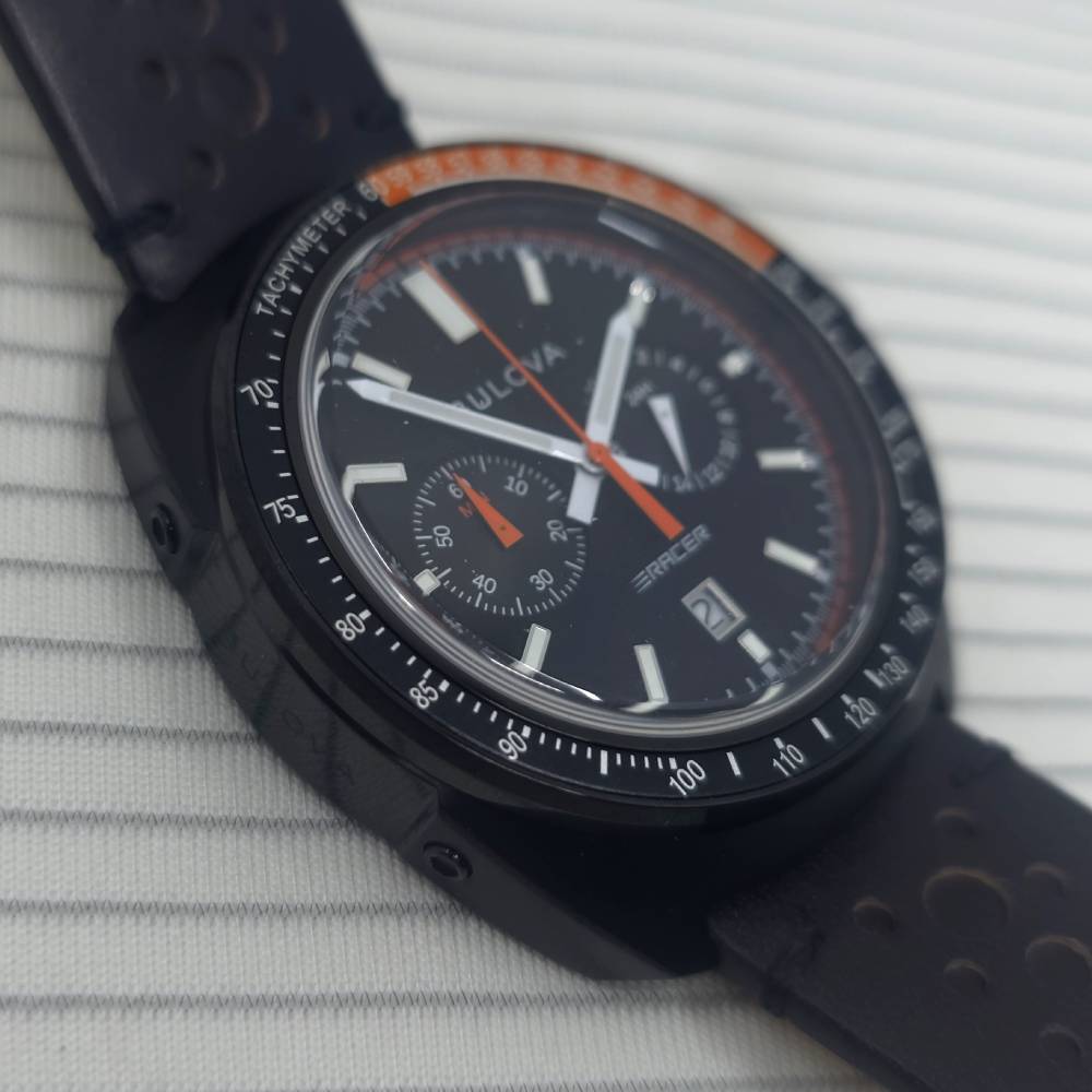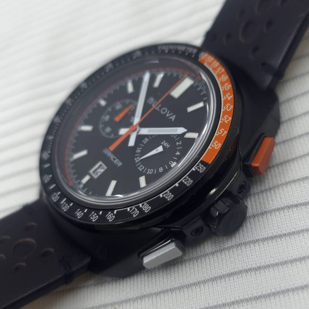 El Bulova Performance Racer 98B428 pertenece a la colección Racer, que celebra la relación histórica de Bulova con el mundo del automovilismo, desde la NASCAR hasta campeonatos de Fórmula Ford. Su diseño dinámico refleja los instrumentos de un automóvil de carreras, con una esfera negra con detalles en naranja, índices y manecillas luminiscentes, calendario a las 6 y un indicador de 24 horas a las 3.