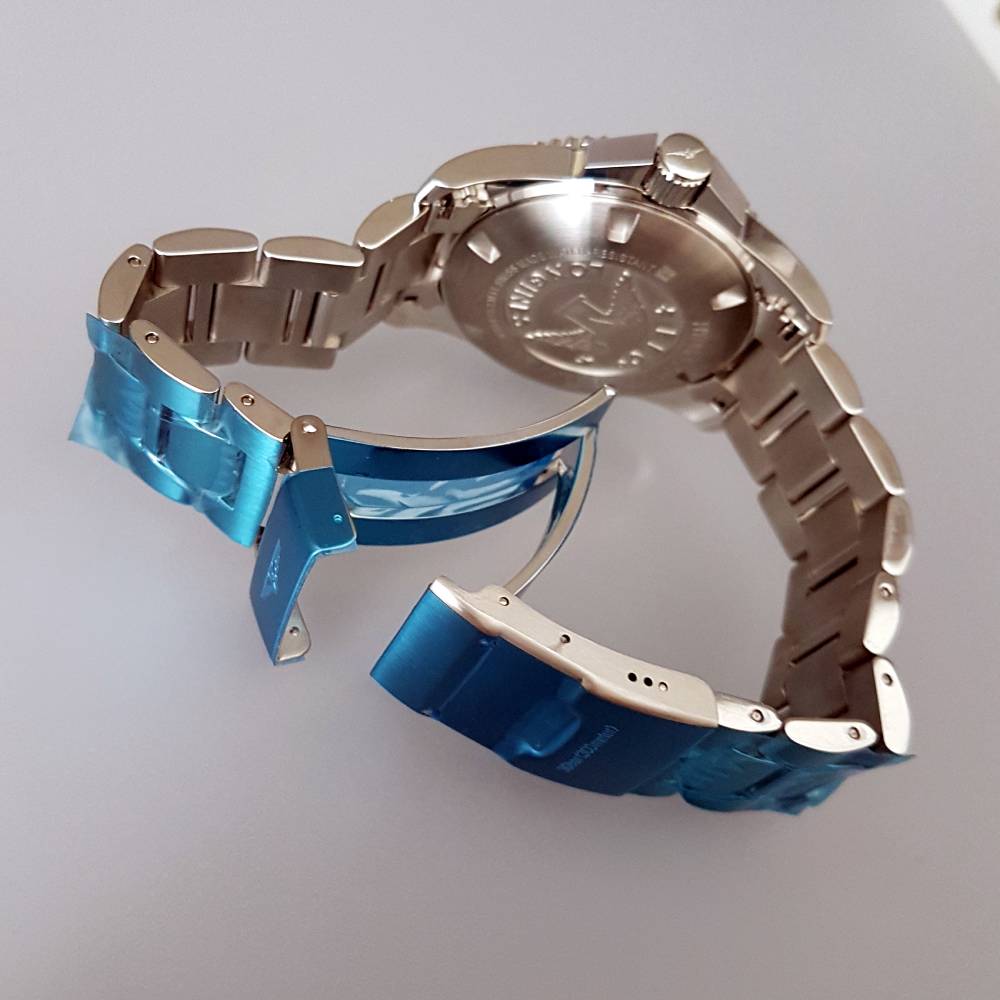 El reloj está protegido por un cristal de zafiro plano antirreflectante y tiene una resistencia al agua de hasta 300 metros (30 ATM), apto para buceo recreativo y deportes acuáticos. La pulsera de acero inoxidable con cierre deployante de triple seguridad ofrece comodidad y ajuste seguro.