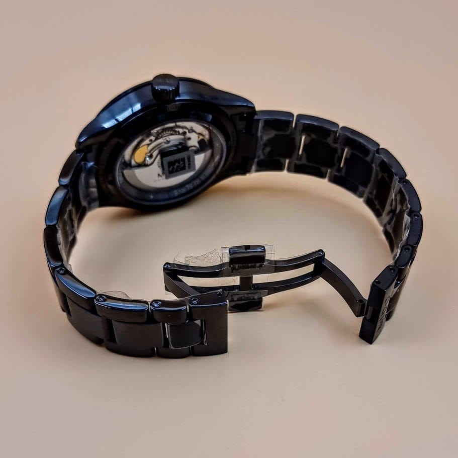Equipado con cristal de zafiro esférico antirreflectante y resistencia al agua de 10 ATM (100 m), este reloj es apto para el uso diario y actividades acuáticas ligeras. La correa de acero pavonado negro con deployante doble asegura comodidad y ajuste perfecto.